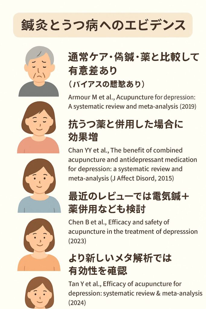 • Chan YY et al., The benefit of combined acupuncture and antidepressant medication for depression: a systematic review and meta-analysis (J Affect Disord, 2015) — 抗うつ薬と併用した場合の効果を解析、併用で効果増。PubMed