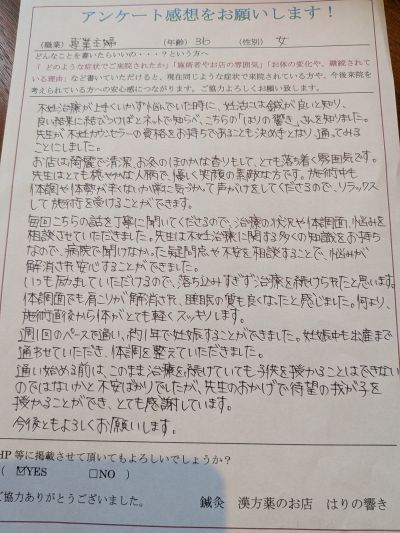 通院していればいつかは授かれると思っていましたが、時は過ぎるばかりで、生理が来るたびに落ち込む日々でした。そんな時、同じ市内で不妊に力を入れている、こちらのお店を知りお世話になっています。