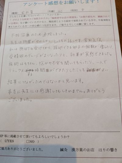 不妊治療をしていて、鍼が良いと前々から聞いていたので通ってみようと思いました。
